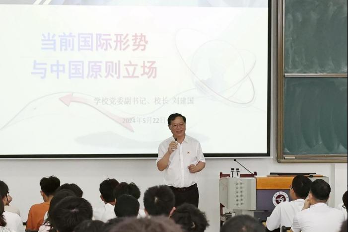 刘建国以《当前国际形势与中国原则立场》为主题,从“从动荡变革的世界、全球瞩目的热点、大国风范的外交”三个方面向同学们讲述当前国际形势。他先以新冠疫情可以看作全球变局的“加速器”为切入点,阐述了地缘安全状况复杂多变、国际格局多极秩序加速整合、世界经济复苏困难重重、极端天气更是加剧了全球安全风险。再以“止跌企稳的中美关系”“反复上演的巴以冲突”“俄乌拉锯战”为例,深刻阐释了世界正进入百年未有之动荡变革期,中国的发展机遇与挑战并存。最后,他详细的向同学们解读了在热点问题频出的国际形势背景下,中国应对国际热点问题的原则立场和中国外交的战略部署。