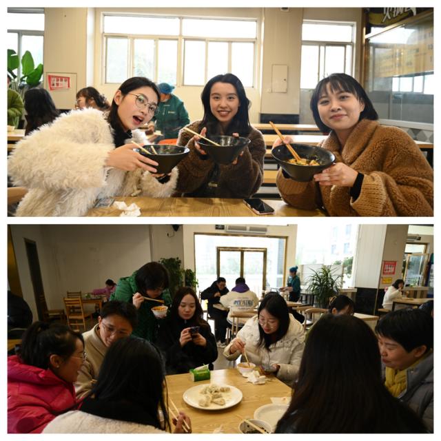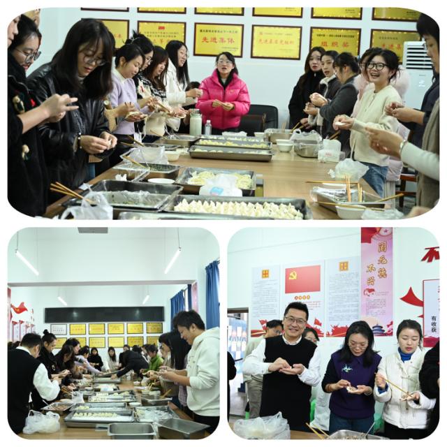 案板上,面皮雪白,馅料丰盈,老师们纷纷撸起袖子,化身“包饺子能手”:一捏、一合、一压,普通的面团在手中变幻成形态各异的饺子。无论是经验老道的“老手”,还是初次尝试的新手,每个人都乐在其中,彼此交流着独特的技巧,分享着自己的心得。老师们时而切磋厨艺,时而聊起学术与生活,彼此间的情谊在这轻松愉悦的氛围中不断升温。随着一盘盘热气腾腾的饺子出锅,大家品尝着自己亲手包的饺子,不仅是味觉上的满足,更是心灵的交融。
