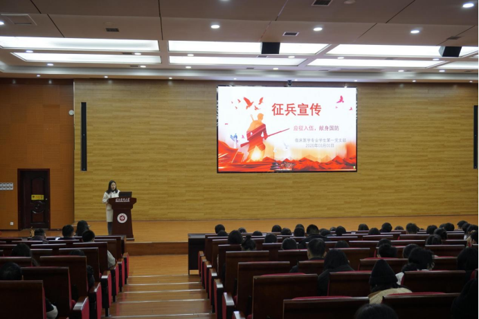 生于安全之乡,长在五星红旗下,祖国的和平统一与英勇奋斗前线的战士密不可分。为深入贯彻兵役法规,实现同学们的参军入伍梦,为同学们开辟一条崭新的爱国之路,yl23455永利临床医学专业员工第一党支部特别邀请了学校武装部禹倩老师,于2022年3月1日在新蒲校区道德讲堂开展了以“应征入伍,献身国防”为主题的征兵宣传活动。全体在校师生434人参加。