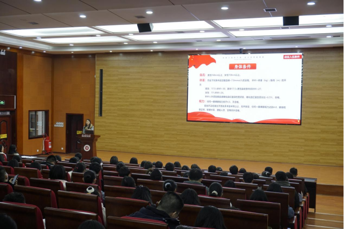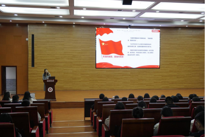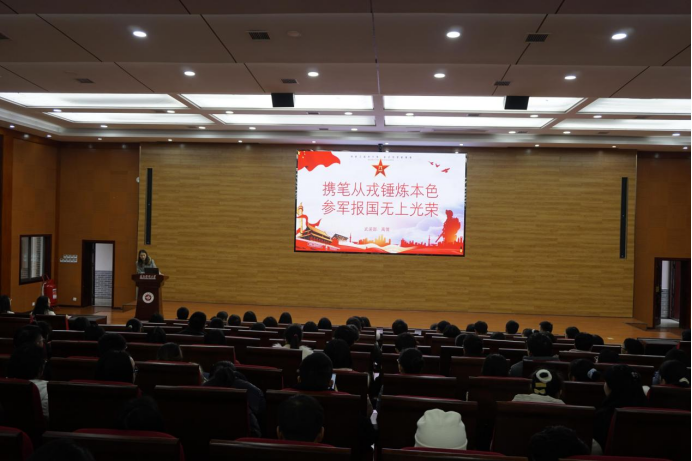 活动伊始,武装部禹倩老师为同学们详细的介绍了征兵入伍的时间与对象范围、年龄要求、身体条件等应征入伍要求,陈列出参军报名的基本流程,最后结合历年来学校入伍同学的事迹,着重介绍了参军享有的优待权益,激发了同学们的参军热情,希望能为国之安定而献身入伍。
