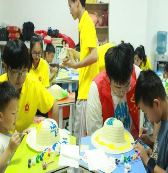 动手动脑,巧手生花。活动过程中,志愿者们引导和组织现场儿童开展了“手工彩绘草帽”“有趣的植物拓染”“百变大咖秀”等活动,在活动过程中实践队鼓励和指导孩子们大胆创作,此环节充分展示了他们的动手和协作能力,从他们生动有趣的作品中迸发出了丰富的想象力和创造力。