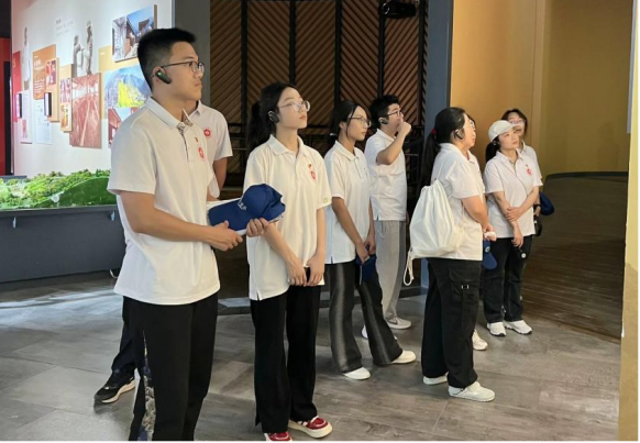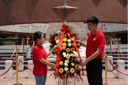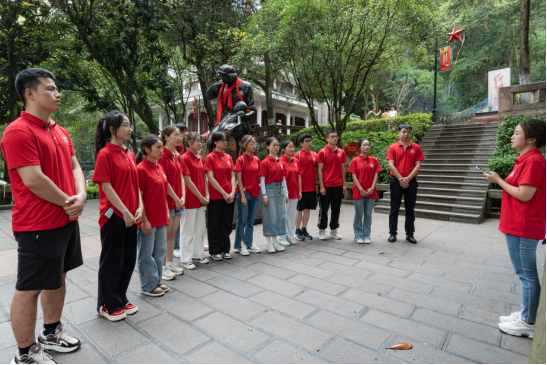 寻访红色圣地,探忆峥嵘岁月。在遵义会议会址纪念馆、苟坝会议会址等地,实践队员深入学习党的光辉历史,踏寻红色足迹、追溯红色记忆、挖掘红色故事,并对现场游客进行了访谈;在凤凰山红军烈士陵园,实践队员在烈士纪念碑前敬献了花篮、集体默哀、重温入团誓词并绕行纪念碑一周,表达对革命先烈的崇高敬意以及青年学子不忘初心、勇担使命的坚定信念;在革命先烈龙思泉雕塑前,带队老师田源为实践队员介绍了红军长征的历史以及邓萍、龙思泉等先烈的事迹;在苟坝会议会址,全体实践队员深情朗诵了《七律·长征》,深刻感受中国工农红军大无畏的革命精神和英勇豪迈的气概。
