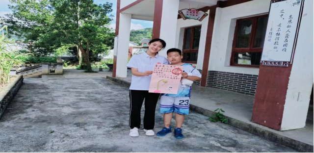 建设乡村法治宣传阵地,夯实群众法治信仰根基。在枫香镇保海村保陇小学,实践队聚焦群众法律援助、生态环境治理、道路交通安全等日常生活领域,绘制乡村法律知识扫码学习文化墙,提高村民法律知识学习的针对性和便捷性。实践队捐赠20余册法律著作书籍和法律文本,建设乡村法治文化图书角,并带领小朋友们参观、互动和学习。实践队聚焦儿童生命健康和财产安全,以绘画、书法、手工粘土、签名墙等为载体,创作防范网络诈骗、青少年权益保护等法治书画作品,进行法治宣传和作品展览,耐心解答小朋友的疑惑和问题,提高乡村小朋友的法治意识和法治能力。夜晚,实践队组织开展“法治夜谈”,有幸邀请到在村小教师岗位默默坚守了20余年的黄文贵老师,他满腔热情地向队员们讲述教育法治事业的发展历程,以及他亲身经历的典型法治案例。队员们认真聆听,不时与黄老师对话交流农村教育事业和乡村法治现状,大家深受启迪,对法治国家、法治社会、法治政府建设尤其是乡村振兴法治建设有了新的认识。