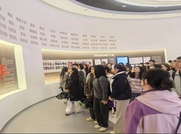 参观期间,师生在讲解员的带领下有序走进展厅。讲解员首先对展厅的整体布局与建设意义进行了介绍,让参与者对本次参观有了初步的框架性认知,并回顾了习近平总书记提出铸牢中华民族共同体意识的历史脉络和理论基础,深切感受党的民族政策的光辉指引和辉煌实践,教育引导师生进一步铸牢中华民族共同体意识,大力弘扬民族团结光荣传统。大家一边认真聆听讲解,一边仔细观看展厅中一张张生动多彩的图片和一段段记载历史的文字,全方位、多角度展示了中华民族“四个共同”根脉、中国共产党百年经验探索、中华民族多姿多彩文化,以及全市在铸牢中华民族共同体意识示范试点工作方面的生动实践。