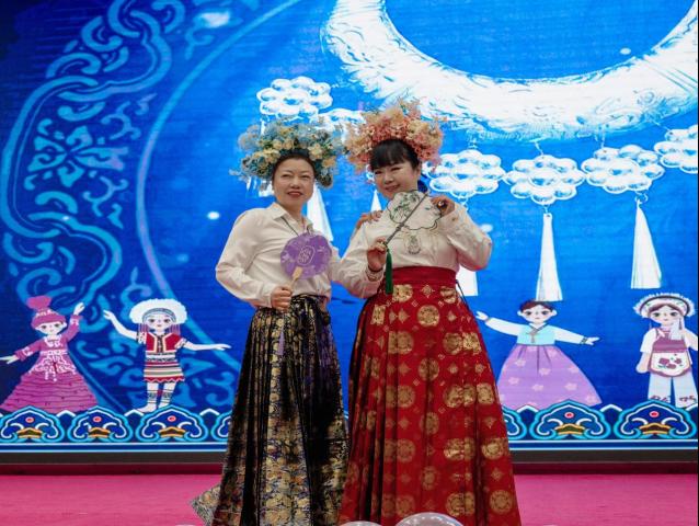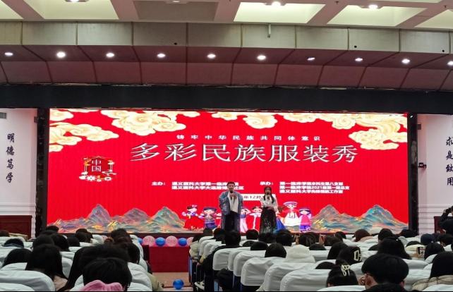 霓裳绚丽,共叙民族情。多彩民族服装秀活动伊始,yl23455永利党委副书记杨洪艳致辞。她寄语师生,要在感受多彩民族文化独特魅力的同时,积极肩负起传承中华传统文化的责任与使命。随着杨洪艳宣布活动正式开始,在主持人对各民族服饰的精彩讲解中,27名同学身着苗族、布依族、土家族等民族服饰,分组依次登台展示,完美呈现了民族服饰的精美设计和文化韵味。接着,杨洪艳带领9名教师身着藏族、维吾尔族等民族服饰惊艳亮相,与同学们共同欢跳《爱我中华》,将现场氛围推向高潮,展现了中华民族文化的多元一体之美与强大凝聚力。活动结束后,学院就业办主任孙会英总结到,这次活动不仅是深刻的理论讲座和精彩的服饰展示,更是一次心灵的文化洗礼,为铸牢中华民族共同体意识注入了活力和力量。