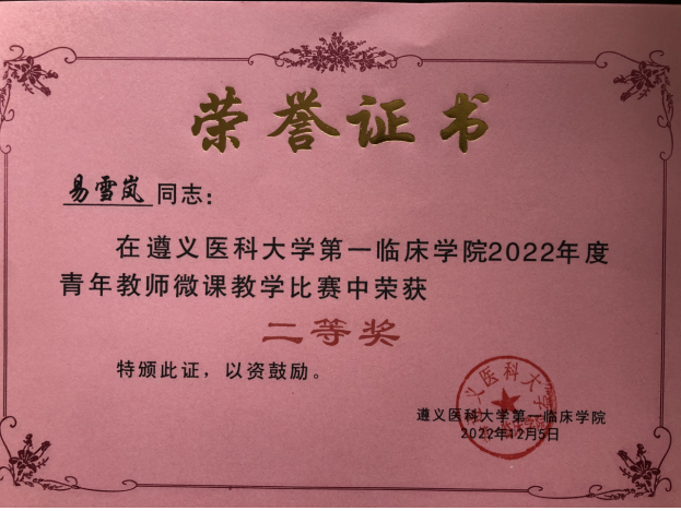 祝贺易雪岚副教授荣获2022年度青年教师微课教学比赛中荣获“二等奖”!