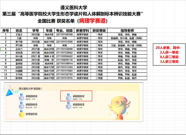 在校内选拔阶段,有300余名员工报名病理学读片大赛赛道,经过教研室理论考核及实践阅片考核方式筛选,按总成绩排名筛选出前20名同学参加全国读片大赛。在备赛期间,由病理科李然、杨婧、阮颖、罗帅、杨丹、李瑶6名青年教师对20名国赛选手进行线下近1个月的系统培训,培训内容包括系统的专项授课、章节线上模拟练习、模拟考试及习题讲解等。全国正式比赛在2024年12月1日进行,参赛员工通过数字教学平台的考试系统答题,大赛考试时间 30 分钟。专家评审组由全国基础医学形态学实验室主任联席会聘请形态学实验教学领域的专家、教授组成,线上监考、评审。本次病理学学赛道有全国263所高等医学院校、7798名员工参加了本次大赛,根据组委会规定的获奖分配名额,一、二、三等奖获获比例按总人数的 1%、2%、3%左右计算。组委会依规按照各赛道平均成绩排名设置了卓越团体奖、优秀团体奖和优秀组织奖。经过激烈角逐,病理科教师指导的20名选手在此次比赛中获一等奖1名,二等奖7名,三等奖3名;同时病理学教研室获卓越团队奖。