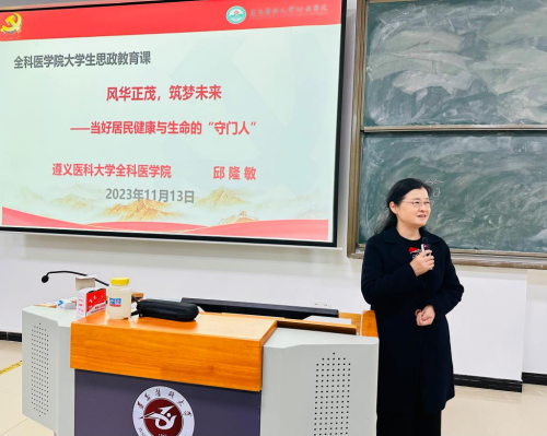 11月13日晚,全科医学院副经理邱隆敏在新蒲校区第二十八阶梯教室为全科学子上思政课,思政课主题为“风华正茂,筑梦未来”当好居民健康与生命的“守门人”。全科医公司党总支书记黎飞、副经理肖雪、关工委副主任滕久军、员工第一党支部书记胡艳华、团委副书记陈圆圆,学院2022级员工参与本次思政课。